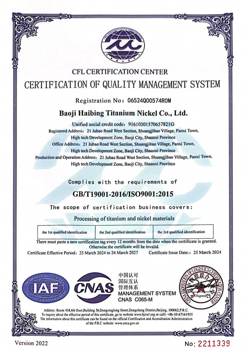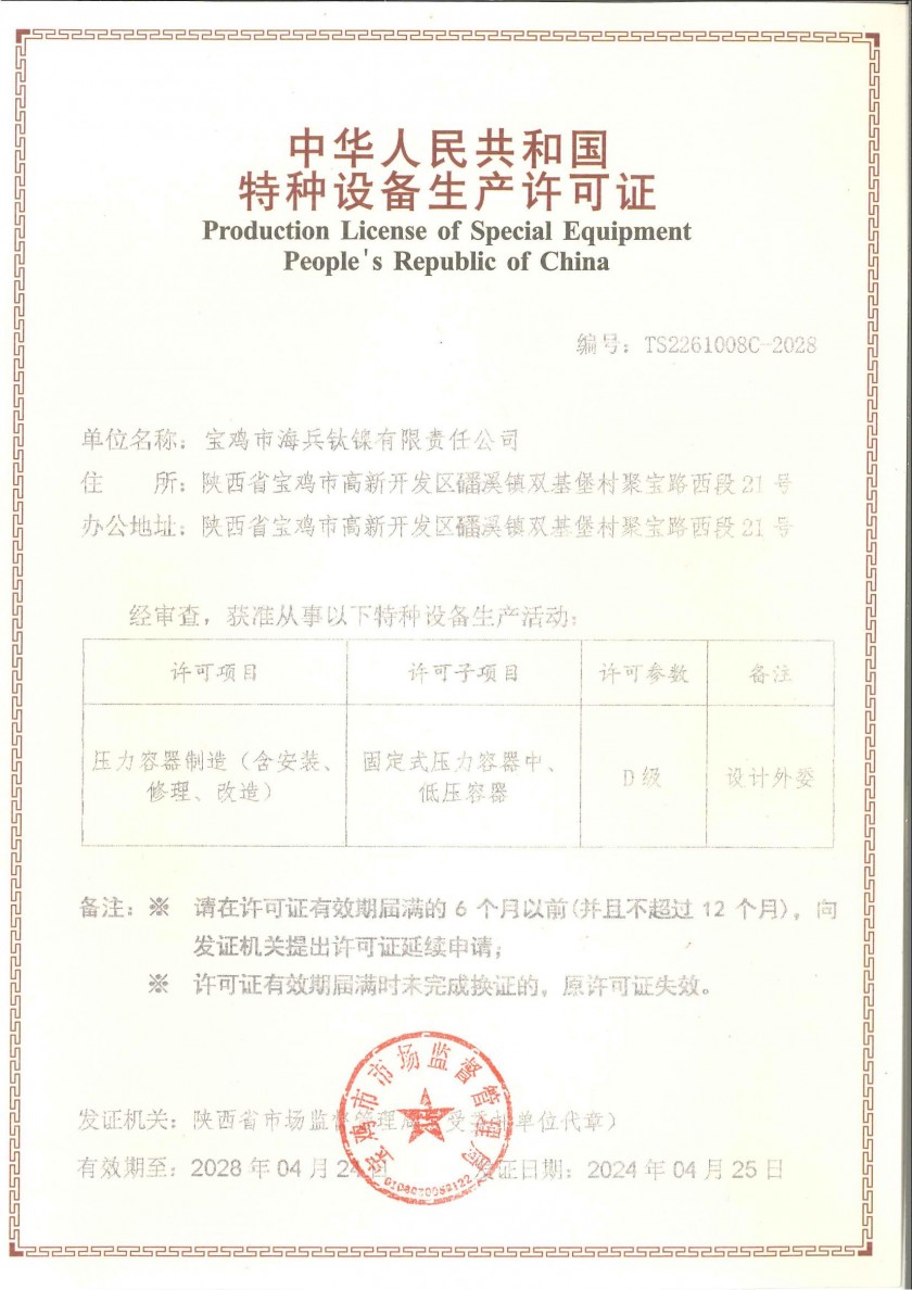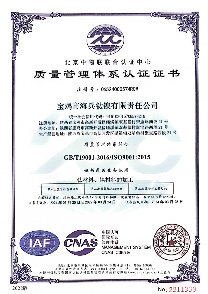 宝鸡市海兵钛镍有限责任公司(简称:海兵钛镍)是一家专业从事有色金属钛材、镍材、锆材等稀贵金属生产、加工、销售的综合性企业。海兵钛镍成立于2011年 ,至今已有15余年的发展史。公司位于中国钛谷——陕西宝鸡。交通便利 ,地理位置优越。